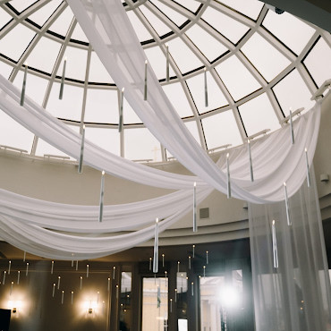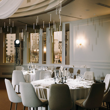 Белоснежный зал расположен на 50-м этаже небоскреба «Высоцкий» в самом центре города. Из панорамных окон открывается роскошный вид.