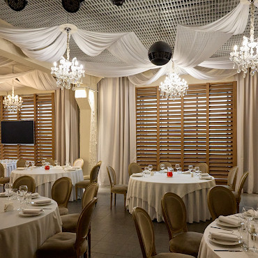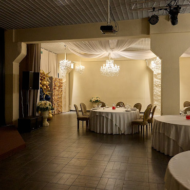 Банкетный зал встречает портьерами, золотом и хрустальными люстрами. Гости ценят ресторан за кондиционеры летом и вегетарианское меню круглый год.