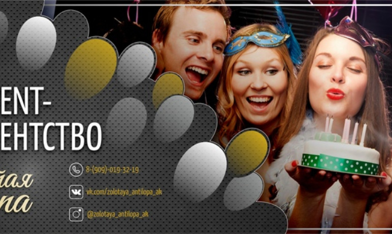 Event- агентство «Золотая Антилопа» предлагает услуги по организации праздников, а именно: свадьбы, предложения руки и сердца, встреча из роддома, юбилеи, дни рождения, детские праздники, корпоративы, тимбилдинги, тренинги.